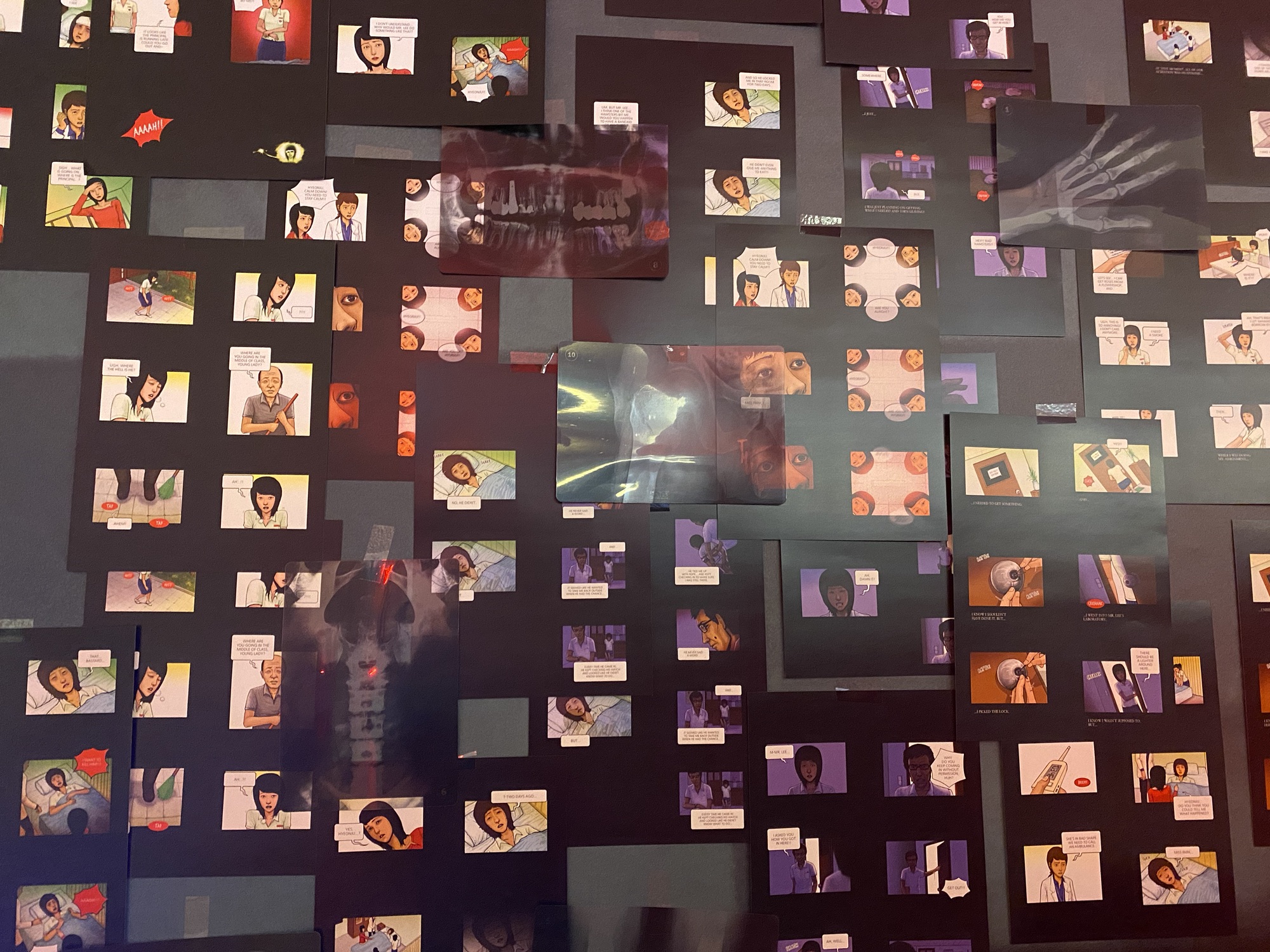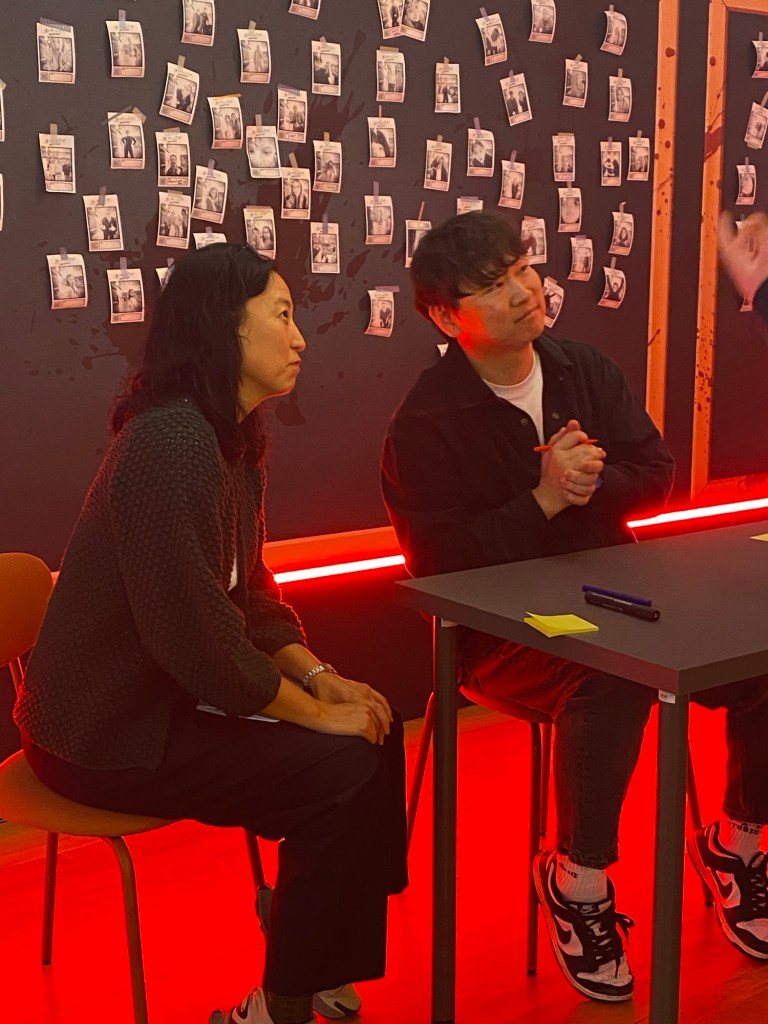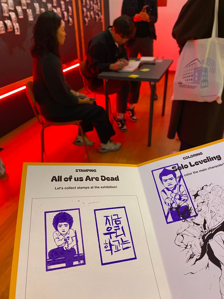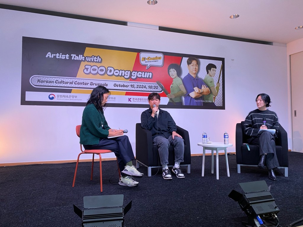Après avoir traversé et admiré l’exposition K-COMICS, qui présente « All of Us Are Dead » et « Solo Leveling », où l’on peut découvrir le travail graphique et des objets de la série, je me suis dirigée vers la salle. Quelle surprise ! Elle était pleine à craquer. Au fur et à mesure que le public arrivait, les organisateurs cherchaient dans toutes les pièces du Centre culturel des chaises à mettre à disposition. Les profils étaient divers et certaines personnes étaient venues d’Arlon en train . Puis Dong-geun Joo a fait son apparition. Malgré son succès, le précurseur du webtoon coréen et des manhwa (bande dessinée coréenne) s’est présenté en nous remerciant de nous intéresser à son oeuvre. On aurait dit que c’était lui qui était le fan venu voir son idole. Gentillesse, humilité, passion pour son travail et surtout joie de vivre: voilà les qualificatifs que l’on peut lui accorder.