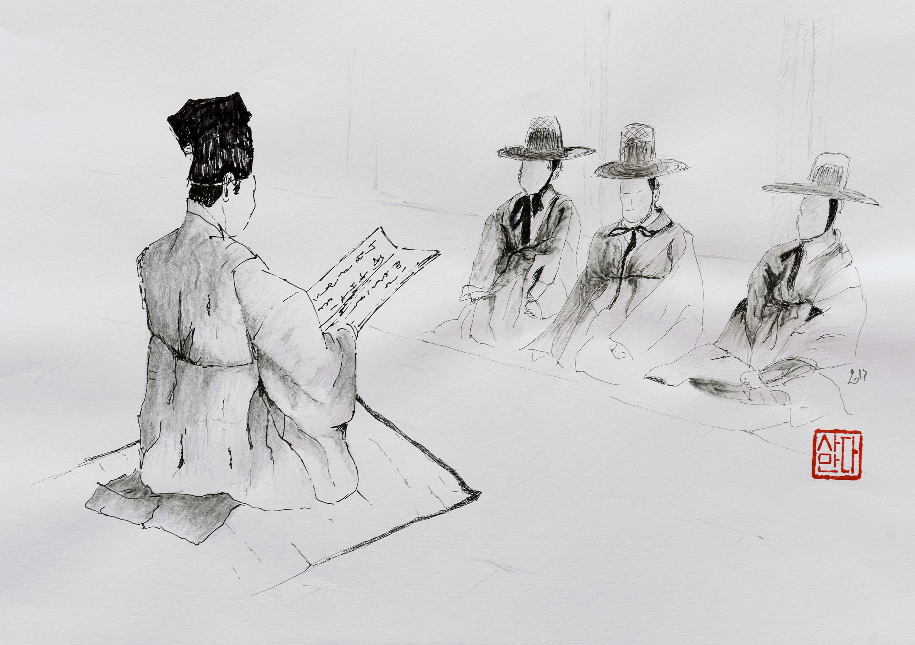 Mine de plomb, rotring et graphite aquarellable – moines confucéens au monastère de Dosan Seowon en Corée du Sud