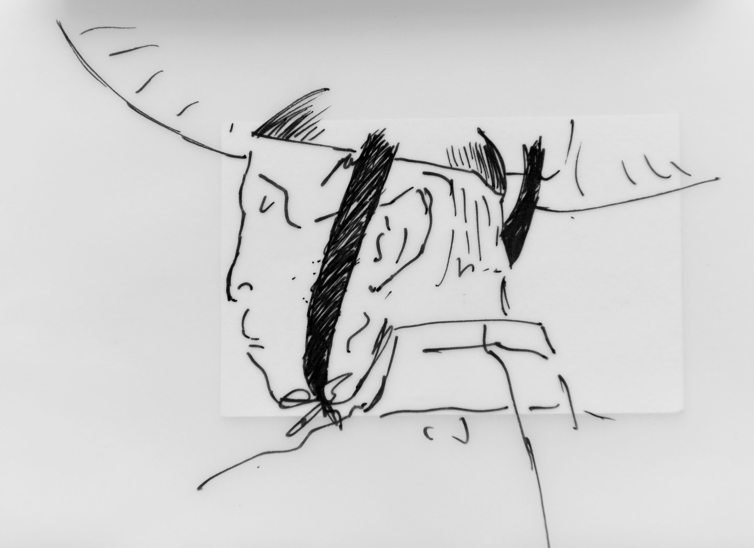 Croquis au feutre noir sur calque d’un moine confucéen au monastère de Dosan Seowon en Corée du Sud