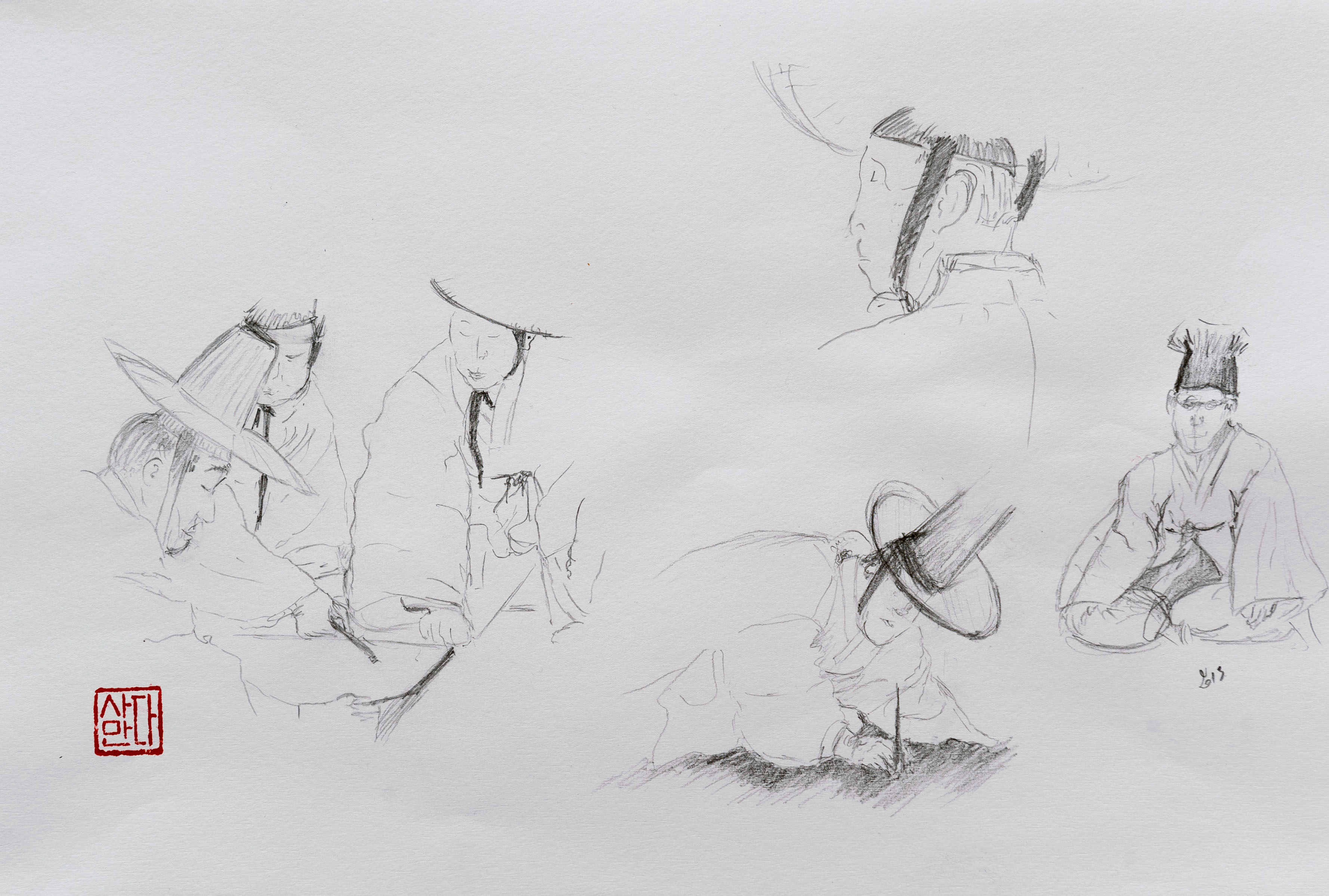 Mine de plomb, rotring et graphite aquarellable – moines confucéens au monastère de Dosan Seowon en Corée du Sud